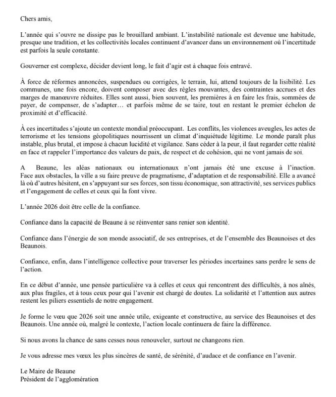 Dans ses vœux pour 2026, le maire de Beaune Alain Suguenot revient sur un contexte difficile mais insiste sur la capacité de la ville à avancer, grâce à ses forces locales et à une confiance partagée.