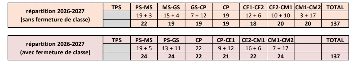 - Pour la rentrée 2026, le nombre d'élèves attendu à date est de 137 ; 49 en maternelle et 88 en élémentaire. L’école accueillera 31 CP, il faudra les répartir dans 2 classes pour que « les élèves soient dans de bonnes conditions d'apprentissage. Le profil des élèves est peu propice aux classes multi-niveaux. C'est en maternelle qu'il n'y aurait probablement que 2 classes en cas de fermeture ».