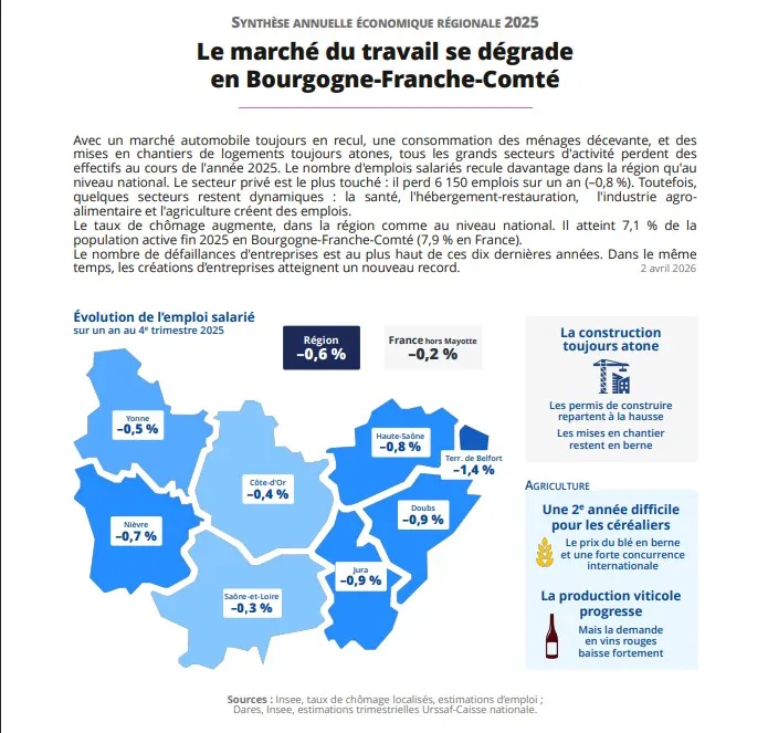 La Bourgogne-Franche-Comté enregistre une baisse de l’emploi salarié en 2025, accompagnée d’une hausse du chômage. Tous les secteurs sont touchés, malgré quelques activités encore dynamiques.