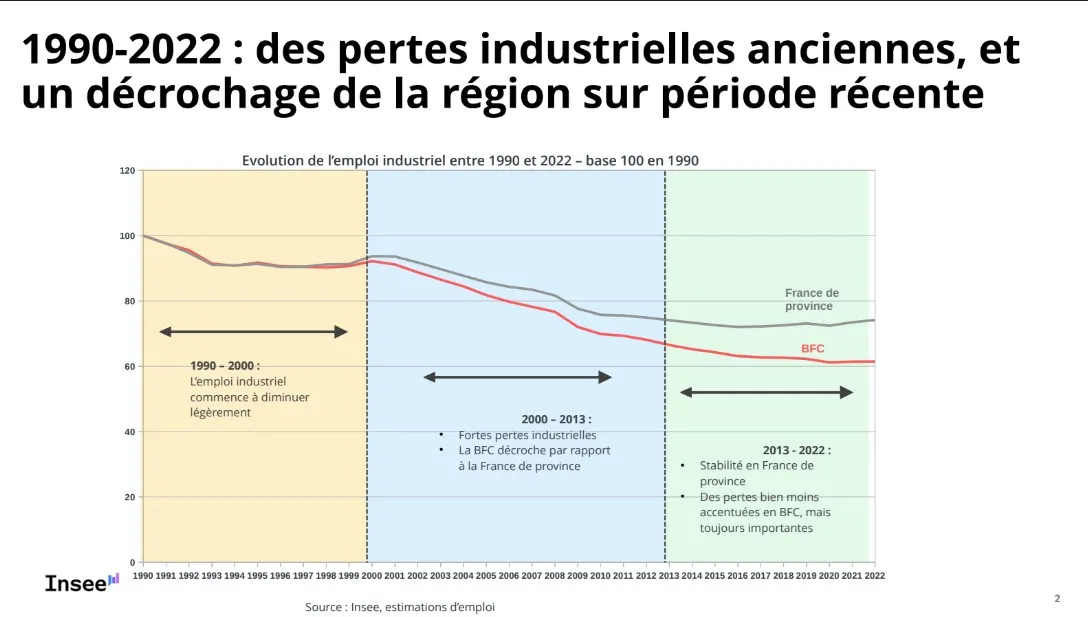 Une situation analysée par l’institut qui soulève plusieurs raisons de ce déclin progressif. « La Bourgogne-Franche-Comté est spécialisée dans des secteurs industriels en difficulté, comme l'automobile, et moins présente sur les créneaux porteurs. » Outre l’automobile, les domaines de la métallurgie, du plastique, voire du bois et papier participent à cette baisse selon l’étude. La forte désindustrialisation de ces 20 dernières années est aussi citée. « La région paye encore le prix de la crise des années 2000, comme l'ensemble du grand quart nord-est. »