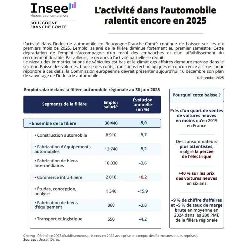 L’année 2025 est difficile pour l’industrie automobile en Bourgogne-Franche-Comté. En un an, 5% des emplois ont disparu dans la filière, soit près de 2 000 postes. Moins de ventes et des entreprises en difficulté, l'INSEE dévoile sa dernière étude sur le sujet.